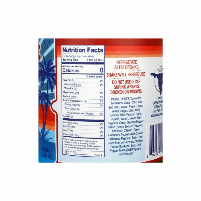 INGREDIENTS: Tomatillos (Tomatillos, Water, Citric Acid and Salt), Water, Pears (Pears, Water, Sugar, Citric Acid), Onions, Rice Vinegar, Garlic (Garlic, Water), Green Bell Peppers, Green Serrano Pepper Mash (Green Serrano Peppers, and Salt), Cilantro, Green Habanero Pepper Mash (Green Habanero Peppers, Salt), Lime Juice from concentrate, Scallion Puree (Scallions, Salt), Datil Pepper Mash (Datil Peppers, and Vinegar), Xanthan Gum