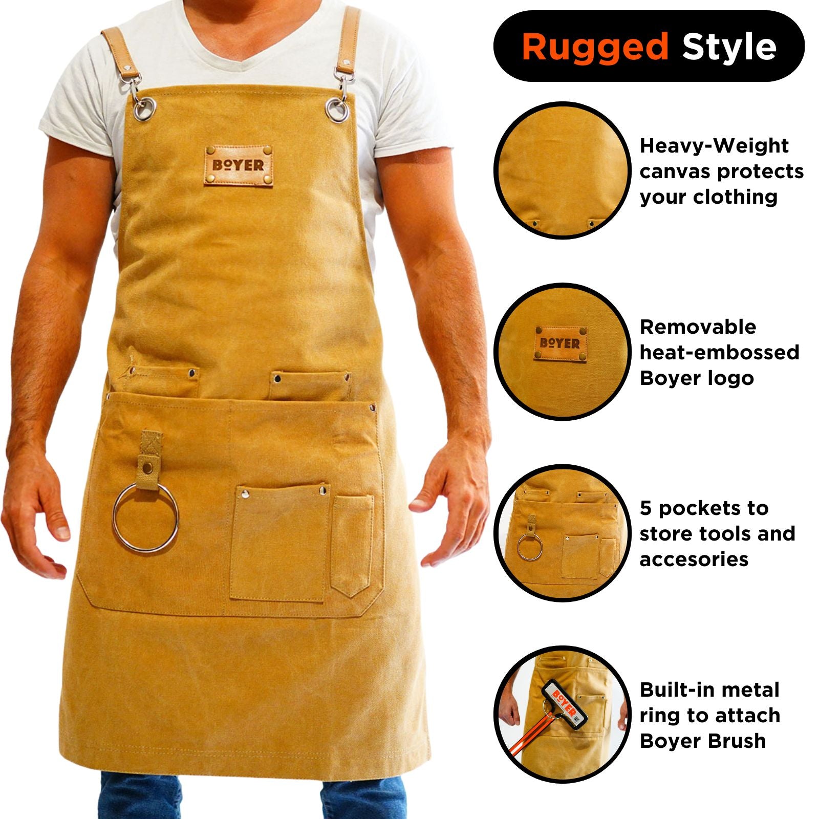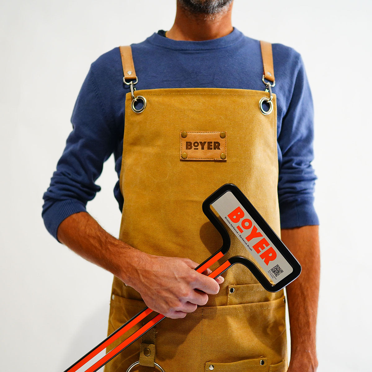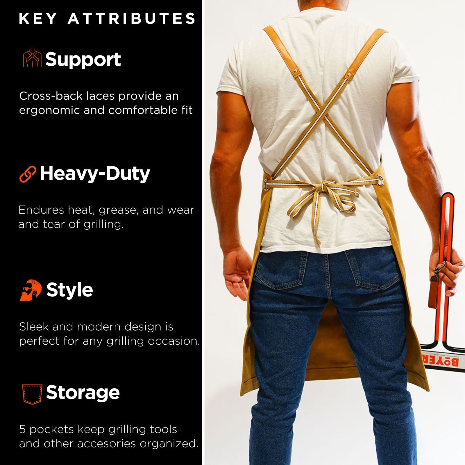 The Boyer Apron is made with resilient materials, featuring cross-back laces for support, five convenient pockets, and a metal ring for your grill brush. Built to endure the heat and keep you organized, this apron ensures you look sharp and stay efficient during every BBQ adventure.