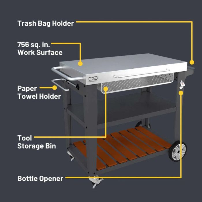 CONSTRUCTION: The large stainless-steel 756-square-inch work surface is smooth, non-porous and easy to clean. Cold rolled painted steel construction gives the cart a solid feel and durable finish that prevents rust to extend the life of your cart.