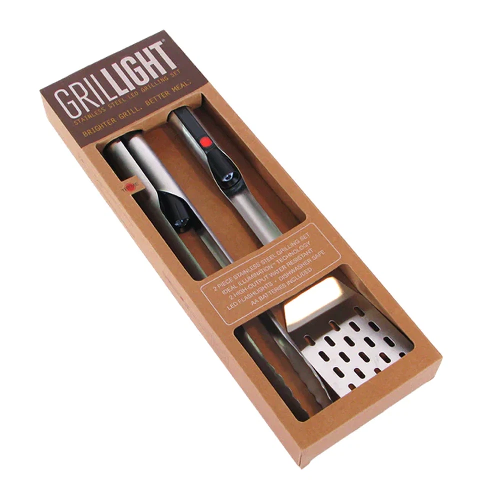 Grillight LED grill tools are the best thing to happen to your bbq since charcoal. The 200 lumen light built directly into the tongs and spatula always points exactly where it's needed. The flashlight is bright enough to light up any grill and is easily removable for washing. These grilling tools are also water resistant.