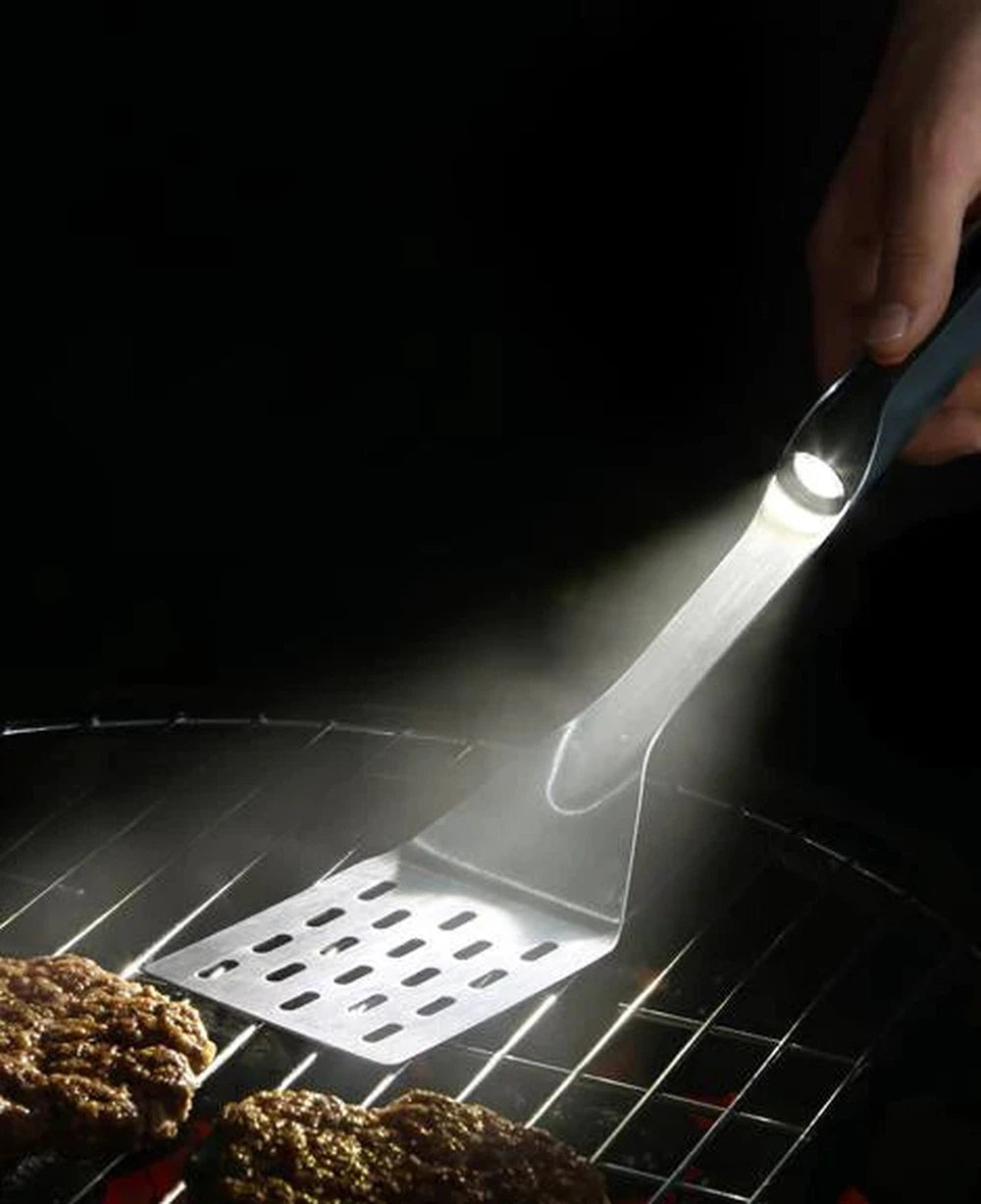 The built in 200 Lumen LED flashlights in our spatula and tongs are bright enough to light up any grill. Never worry about grilling in low-light conditions again! The LED lights are built into the grill tools and always point exactly where you need them. We use patented Ideal Illumination technology, so you'll always see the true color of your food.