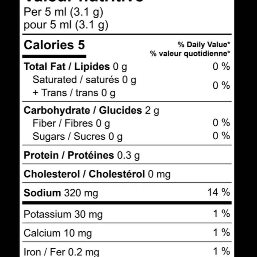 Seasoned salt (salt, sugar, pepper, paprika, onion, garlic, corn starch, vegetable fat, spice extract, silicon dioxide), Granulated garlic, Mexican chili powder, Black pepper, Horseradish powder, Paprika, Tomato powder, Coffee.