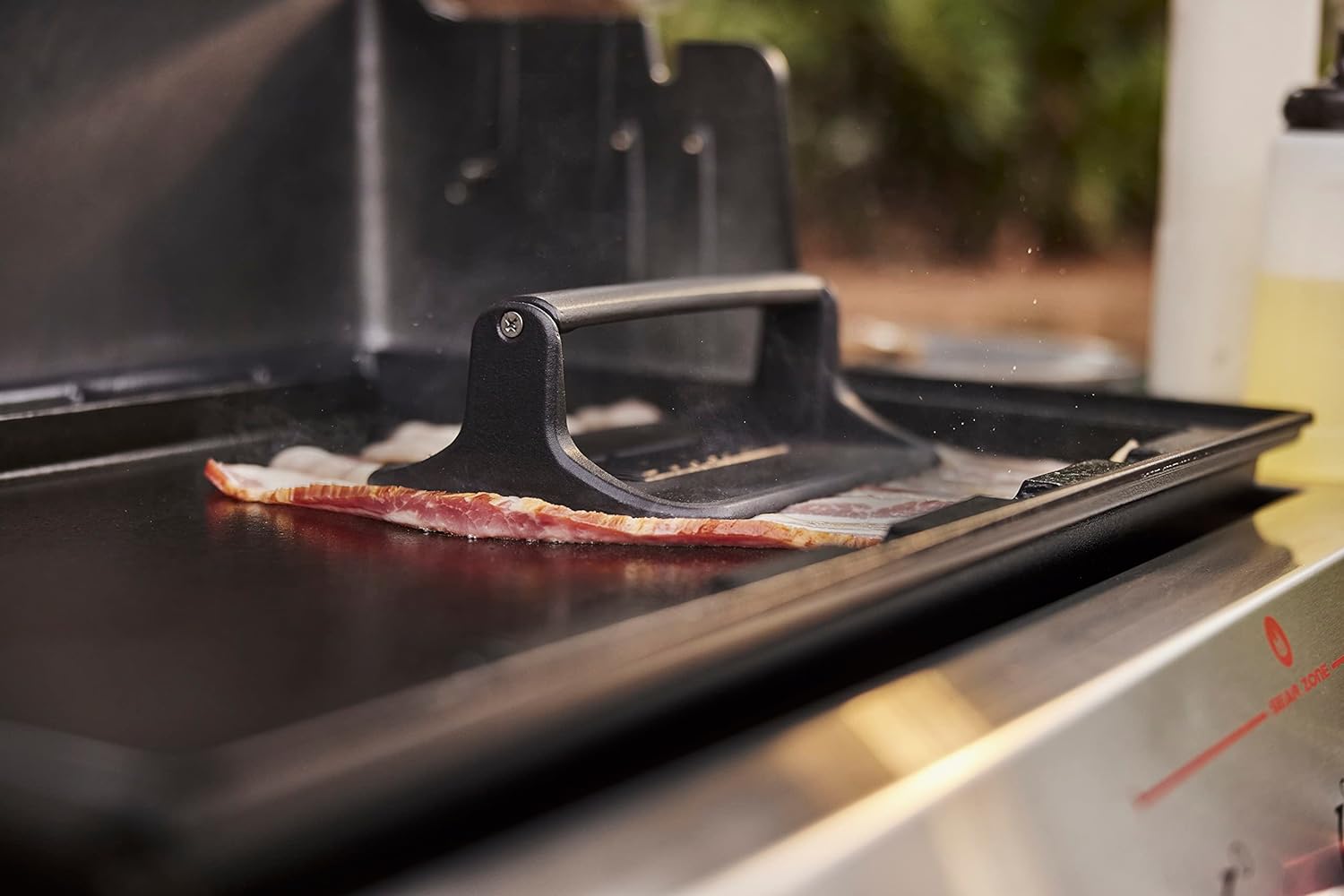 • Weighted to press burgers, paninis, and keep bacon from curling