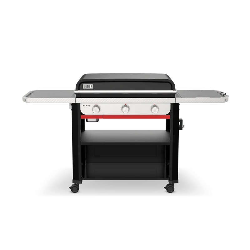 Have more fun griddling on the game changing, 30” rust-resistant Weber® Slate™ griddle featuring a pre-seasoned carbon-steel cooktop that’s ready to cook on right out of the box and stays ready, not rusty, use after use. It reaches over 500°F and heats evenly edge-to-edge, so your food cooks consistently no matter where you place it on the griddle. Create crispy smashed burgers and bacon, beautifully browned pancakes and paninis, flavourful fajitas and stir fries, and more. Plus, with the Weber Works™ Prep, Cook, and Store System you can keep cooking and cleaning supplies handy, carry food and condiments from the kitchen to the griddle, convert the side table into a prep station and stow gear in tightly sealed containers (accessories sold separately).